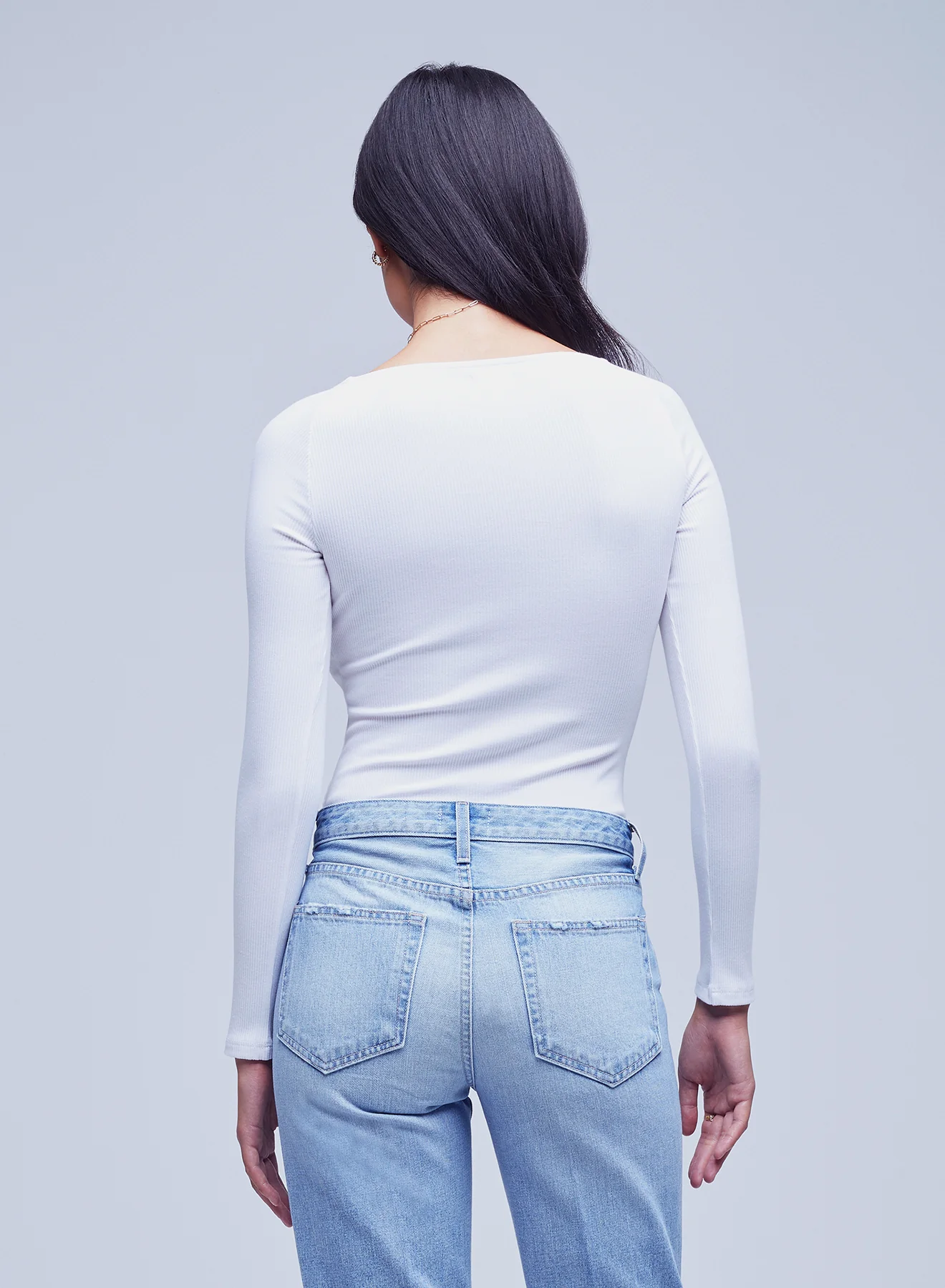 An elegant wide V-neckline bodysuit in pure white. Supple ribbed-knit style extends into cheeky self-panty that fastens with a two-snap gusset, creating a smooth, line-free look. Includes long raglan sleeves. Pairs beautifully with denim and skirts.