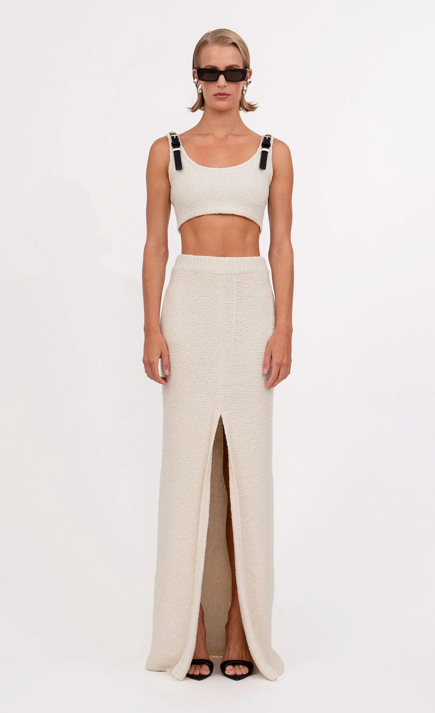 The Otto Crop embodies the essence of NCHLNT style—a timeless silhouette with a modern edge. Crafted from a soft cotton-blend bouclé knit, this cropped top features belt details on each strap for a bold touch. Effortlessly versatile, it pairs perfectly with any bottom or the matching Simone Skirt for the complete look.