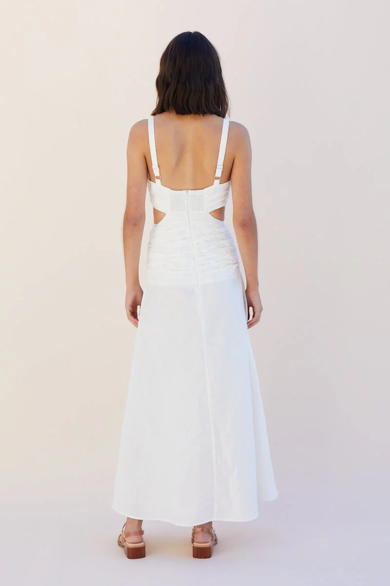 The Aster Cut Out Maxi elegantly hugs the body beautifully with waist cut-outs to shape the figure. The rouched detailing on the hips and waist wraps the body and flows out to a lightweight skirt bottom. Its all-white look elevates it to a modern must-have. The heavyweight fabric is luxurious and supportive, making this the perfect white maxi.